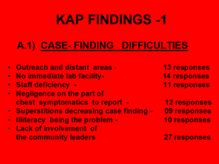 A.2) CONTRIBUTIONS FOR INCREASING CASE-FINDING Door-to-door search for chest symptomatics - 28 responses Health education - 32 responses Referrals - 20 responses Medical camps to increase case finding - 15 responses Approaching through the village leaders -23 responses |