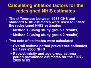 might have been if the NHIS had not been redesigned. We inflated the 1997-2000 NHIS asthma attack prevalence estimates using two methods. The first method used the difference between the 1988 CHS and standard NHIS for study group 1 (seen in the top row in the left-hand column on the previous slide). The second method used the 1988 CHS and standard NHIS difference for study group 2. We used both these methods first on the overall estimates and then on the estimates for age and race/ethnicity subgroups. Because some of the subgroup estimates are based on small numbers, we will not show the results for the individual groups. Rather, we weighted the subgroup estimates to come up with an alternative overall estimate. The results are shown on the next slide |