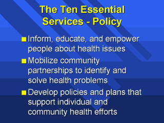 essential services are: Inform, educate, and empower people about health issues Mobilize community partnerships to identify and solve health problems Develop policies and plans that support individual and community health efforts |