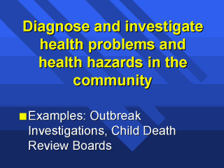 | When problems are identified either by surveillance systems, alert citizens or other means, they need to be investigated. Examples of the essential services “Diagnose and investigate health problems and health hazards in the community” are outbreak investigations done when foodborne illness is reported and child death review boards which examine why children die in a community and how future child deaths can be prevented. |