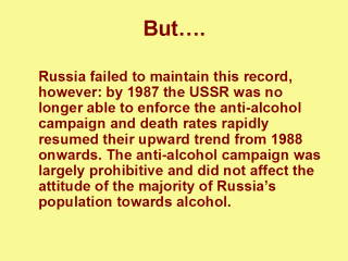 | Thus towards the end of the Soviet period, the Russian population, faced with mortality rates much higher and life expectancy lower that than those of its western neighbors, was already confronting a health crisis which had been developing gradually over the previous two to three decades. |