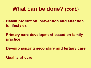 | The directions pursued by the Ministry of Health with regard to health system development still rest on the 1997 “Concept of health care and medical science development in the Russian Federation”. This was a major document upon which reform was (and is) to be based. Nominally, there are four main priorities emerging from this concept. |