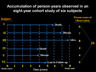 | This diagram illustrates how person-time-at-risk is calculated for a cohort of subjects, where the cohort is the group of individuals who share a common putative risk exposure like work in a coal mine or tobacco smoking. |