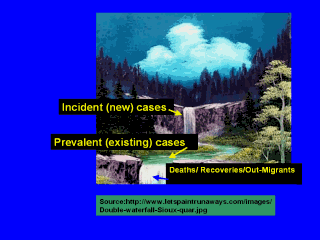 | A waterfall metaphor can be helpful in illustrating the concepts of incidence and prevalence. Commencing at the top of the falls, we see the new cases flowing into the prevalence pool below. The water flowing out of this pool reflects the individuals who die, recover, or migrate out of that population for which the prevalence is measured. |