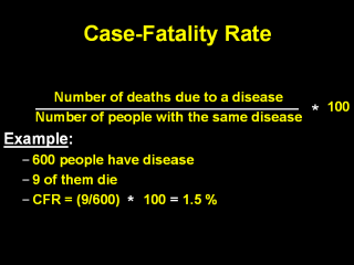 | An important question concerns the proportion of cases of a particular disease which end in death. Epidemiologists label this proportion the case-fatality rate. |