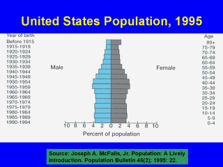 | This slide shows the US population depicted as a pyramid. Please move to the next slide to learn how to construct such a population pyramid. |