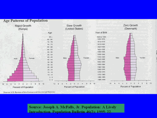 | This slide displays pyramids for three populations exhibiting very different age distributions. Kenya’s pyramid is typical of pyramids for populations in less developed countries. The US population pyramid would resemble Denmark’s much more closely than it does if not for its heavy immigration that is highly selective of younger adults and children. |
