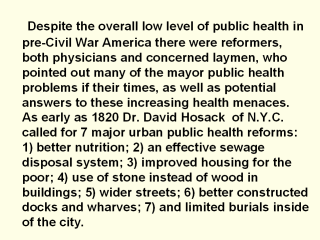 | In 1837 Benjamin W. McCready reported on the public health problems existing in N.Y.C. at that time. His views were refined and restated by Dr. John H. Griscom in his famous 1842 book The Sanitary Condition of the Laboring Population of N.Y., one of the most influential public health documents prior to the Civil War. |