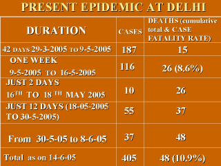continuing till to date. As on 14-6-2005, 405 cases and 48 deaths have been reported. SOURCES: WHO, Regional Office for South East Asia, Communicable Diseases Department report, main page WHO – ROSEA - updates on meningococcal disease in India |