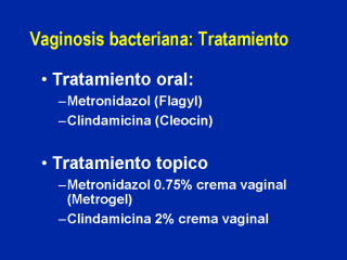 1. Flagyl: 84-96% curso de 7 dias; 54-62% dosis unicae 2. Cleocin: un ensayo clinico mostrando un cura del 94% 3. Metrogel: 75-81% por 5 dias 4. Clindamycin cram: 82-96% por 7 dias * Diferencias no significativas en tasa de curaciones entre las cuatro tratamientos, por lo tanto son igualmente efectivos. * como el 30% recaen al mes del tratamiento (mas para tratamientos topicos) y aquellas mujeres con VB recurrente representan unreto terapeutico El tratamiento de la pareja masculina no reduce la tasa de recurrencia. * Solo tratamiento sistemico oral reduce la morbilidad asociada a embarazo (ie. Parto pretermino). |