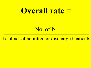 | Drawbacks: Treats all infections as though they are of equal importance. Obscuring changes in uncommon but important infections by unimportant but common ones. Does not distinguish between one infection & multiple infections in one patient. May underestimate. Does not account high risk patients. Does not account length of stay. Unadjusted rates can’t be compared with rate of other hospitals. |