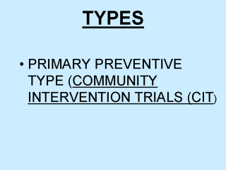 Primary preventive type of interventions which can be done on communities as a whole (community intervention trials) and Secondary preventive therapeutic type of studies will be mostly carried out on the individuals or patients in hospital setting clinical trials. |