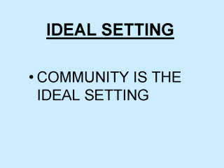 | Community is the ideal setting as all events of life will occur in it and the secondary social structures like schools, churches, play grounds, health facilities, youth clubs etc will be available to help during intervention for motivation to bring about attitudinal change and for applying intervention measure on large scale. |