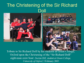 him. “There are moments in a race when you have Trinity or whoever it is chasing just behind you. And Brasenose or whatever boat it is in front. Your muscles are aching. Your lungs are panting. Your heart is close to stopping. And that all important question comes to you - “What am I doing here?” Why do I keep going? Why don’t I just stop and let those guys in the next boat catch me and I can just slow down and stop? It is at those moments that true character is revealed. When the snow is whipping into your face. And your body is sagging with tiredness and your New Zealand coxie is urging you on that you have to find real inspiration to go on. For some people, in part it is what they possess inside that drives them on. But for others, in fact for all rowers, it is in part a desire to do well for Green College. A desire to show that the rest of the University community – what we stand for. What our ideals as a College are. ... at the centre of our values is a deep valuing of humanity, a caring for both the body and the soul and a desire to improve the lot of our fellows either through medicine or research or education. No one person so exemplifies our values as our founder and the first Warden of this College – Sir Richard Doll. That is why it is an honour to name the boat after Sir Richard Doll knowing that his inner virtues and strengths will be an inspiration for future generations of Green College rowers as they face their own breaking point out on the river.” |