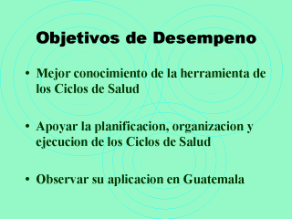 | Es clave entender el Programa Ciclos de la Salud como una aplicación práctica. Una práctica que es calendarizada y puesta en acción en una base anual. Se diseña exclusivamente para trabajar en Guatemala, pero puede ser aplicada con algunas modificaciones en la India y Perú. |