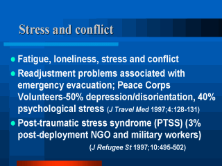 References: Hirshon JM, Eng TR, Brunkow KA, Hartzell N. Psychological and readjustment problems associated with emergency evacuation of Peace Corps volunteers. Journal of Travel Medicine. 1997; 4:128–131. Pearn J. Pre-deployment education and training for refugee emergencies: Health and safety aspects. Journal of Refugee Studies. 1997; 10: 495-502. |