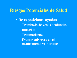 riesgos relacionados a esos eventos no son aun conocidos. Vea: Trombosis de vena profunda relacionada aviajar (http://www.doh.gov.uk/dvt/index.htm) Consulta sobre viajes aereos y tromboembolismo venoso (http://www.who.int/ncd/cvd/dvt.htm) Reino Unido, Casa de Lords, Comite Selecto sobre Ciencia y Tecnologia Quinto Reporte, Viaje aereo y salud (http://www.parliament.the-stationery-office.co.uk/pa/ld199900/ldselect/ldsctech/121/12101.htm) |