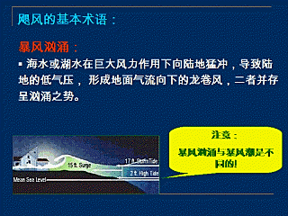 暴风汹涌是盘旋的飓风靠巨大的风力将海水推向陆地,这可以将水面平均升高 15 英尺。另外,风浪又可以加强暴风潮。水面的升高可以导致濒海地区的洪水发生。特别是当暴风潮遇到正常高度的潮汐时。 大西洋和海湾地区是美国人口密集区,而暴风潮的浪潮高度可达10英尺,这造成的灾难是巨大的。