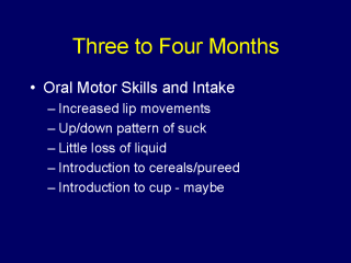 introduced to cereal and pureed foods. The baby may revert to the suckling pattern because of unfamiliarity and need to develop new oral motor patterns. |