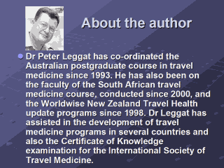 Johannesburg, South Africa. His qualifications include: MD (higher doctorate in medicine), University of Queensland, Australia PhD (in occupational health), University of South Australia DrPH (in travel medicine), James Cook University, Australia Dr Leggat is a specialist in public health medicine and holds Fellowship of several professional organisations. He is a former Fulbright Scholar and also the recipient of the Surgeon General's Medal (Australia) in 2002. He has been a Board Member for the International Society of Travel Medicine (2003-2005), the World Safety Organization (1989-1999, 2003-2005; incl. Director-General 1997-1999), and the Australasian College of Tropical Medicine (1991-Present; incl. President 1996-1998, 2002-2004; President-Elect, 2005-Present). |
