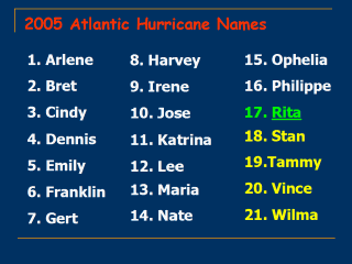 in 1979, men's and women's names were alternated. An international committee of the World Meteorological Organization now creates and maintains the annual lists. Names are used on a six-year rotation, meaning the 2005 list will come up again in 2011. Names of especially damaging and deadly storms are retired. From the 2004 list, Charley, Frances, Ivan and Jeanne, four major hurricanes that struck Florida, will not reappear when the list returns in 2010. On this year's list, Franklin and Lee replace Floyd and Lenny, which were retired in 1999. |