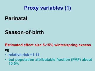operating pre- or peri-natally rather than around the time of onset, Also, while the seasonal excess is small it may have a larger impact. For example, a comprehensive Danish record-linkage study found that the small seasonal excess of schizophrenia births (relative risk = 1.11) was associated with a sizeable (10.5%) population attributable fraction (PAF) for the disorder. The reason for this high PAF is that birth in winter or spring is a common exposure. In other words, because so many people are born winter or spring, a relatively small increase in risk would cause a large increase in the numbers of people with the schizophrenia. |