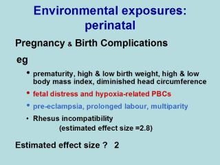 common underlying hypoxia. Some caveats PBCs lack specificity and have a small effect size. There is some but not conclusive evidence relating obstetric complications to brain structure in schizophrenia Methodological problems (eg measurement issues such as relying on maternal recall and/or case records) PBCs may be related to subtypes of schizophrenia. Eg there is mixed evidence of whether PBCs are more common or less common among cases without a family history. Obstetric complications may not adequately reflect complex developmental processes so that the direction of causality may be unclear. For example, a neurodevelopmental abnormality and/or genetic predisposition may directly or indirectly the cause of the increase rates of PBCs. But there are arguments against this in schizophrenia. Other indicators of prenatal developmental delay or disruption are low or high birthweight and diminished head circumference Low birthweight has been associated with schizophrenia; but it is unclear whether this relationship is accounted for by prematurity and/or retarded intrauterine growth. Also one study found that higher birthweight by body length increased the risk for schizophrenia. Diminished head circumference, independent of gestational age, has also been found to increase the risk for schizophrenia. These findings again suggest that a disruption of orderly brain growth in utero may predispose individuals to schizophrenia. |