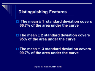 | Therefore, we can see that the mean +/- SD contains 66.7% of the area under the curve. i.e. total area of + 1SD and -1SD is equal to 66.7% (33.35% +33.35%). Similarly, the mean +/- 2 SD contains 95% of the area under the normal curve and the mean +/- 3 standard deviations contains 99.7% of the area under the normal curve. |