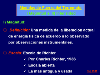 terremoto: 1) Magnitud, e 2) Intensidad. En