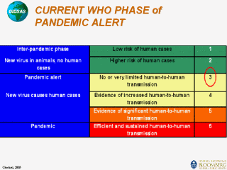 activities. The designation of phases, including decisions on when to move from one phase to another, is made by the Director-General of WHO. Each phase of alert coincides with a series of recommended activities to be undertaken by WHO, the international community, governments, and industry. Changes from one phase to another are triggered by several factors, which include the epidemiological behaviour of the disease and the characteristics of circulating viruses. The world is presently in phase 3: a new influenza virus subtype is causing disease in humans, but is not yet spreading efficiently and sustainably among humans. |