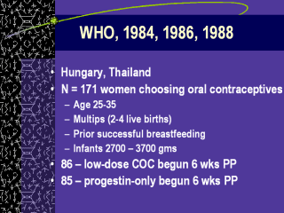 | 30% loss to follow-up Norethindrone 35 mic Problems: Limited details about trial, indicates blinding but not how it was done, no allocation concealment mentioned. No sample size calc, no numerical results or graphs. No mention of discontinuation, loss to follow-up or exclusions. Graphs not labeled. |