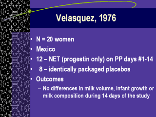 | Norethindrone 35 mic Problems: Limited details about trial, indicates blinding but not how it was done, no allocation concealment mentioned. No sample size calc, no numerical results or graphs. No mention of discontinuation, loss to follow-up or exclusions. Graphs not labeled. |