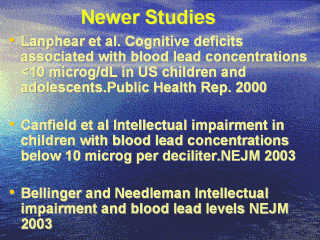 | We studied lead levels in newborn umbilical cord blood. Significant associations were found with IQ scores at 24 months of age. Blood lead levels at 24 months were significantly associated with IQ scores at 10 years of age. |