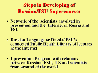 Second, it was important to establish a large Russian Language Lecture Library on the Internet. This is created a backbone for a Russian I-PREVENTION program based upon the model established (Supercourse). |