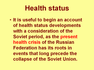| Russia became independent just 14 years ago, and most of adult Russian population didn’t change much their lifestyle and habits as well their work conditions and even system of medical care practically not changed. |