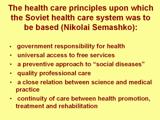 | Based on these principles, the state developed a unified health system which provided free medical services for everyone. Enormous emphasis was placed upon epidemic control and prevention of infectious diseases. |
