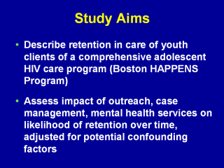 study were twofold. The first was to describe how long youth were retained in care in a comprehensive adolescent HIV care and prevention program called the Boston HAPPENS Program. The second was to assess the impact of outreach, case management, and mental health services on retention times, after adjusting for client demographic and HIV risk characteristics. |