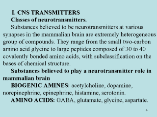 & NUCLEOSIDES: adenosine, ATP. PEPTIDES: carnosine, thyrotropin-releasing hormone, enkephalins, angiotensin II, cholecystokinin, oxytocin, vasopressin, bradykinin, dynorphin, luteinizing hormone-releasing hormone, substance P, substance K, neurotensin, á -melanocyte stimulating hormone, bombesin, somatostatin, secretin, vasoactive intestinal peptide, B -endorphin, glucagon, calcitonin-gene-related peptide, neuropeptide Y, adrenocorticotropic hormone, corcticotropin-releasing factor, insulin. Neurotransmitters can also be subdivided on the bases of their functional roles in other cells. First, there are the substances that have no other known function in mammalian physiology. These include three of biogenic amines (acetylcholine, norepinephrine and dopamine), one amino acid (GABA) and few of the peptides (e.g. neuropeptide Y, calcitonin-gene-related peptide, and substance P). There is a large second class of substances that function as hormones in other tissues but also serve as neurotransmitters. These include three other biogenic amines (epinephrine, histamine, serotonin) and all the remaining peptides. |