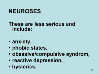 drugs may be grouped into: 1. Antipsychotic (neurileptic, ataractic, major tranquilizer) useful in all type of psychosis, especially schizophrenia. 2. Antianxiety (anxiolytic-sedative, minor tranquilizer) used for anxiety and phobic states. 3. Drugs for affective disorders. A) Antidepressants for minor and major depressive illness, phobic states, obsessive compulsive behavior. B)Antimanic (mood stabilizer) to control mania and break into cyclic affective disorders. 4. Psychotomimetic (psychodysleptic, hallucinogen). |