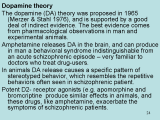 occupancy reaches about 80%. There are many another evidences of DA theory and some contradictions of it. A well-controlled study by Reynolds (1983) however, showed a raised DA content post-mortem in amygdala of schizophrenic subjects, the NA content being normal. Most surprisingly the increased DA content was confined to the left side of the brain, which makes it most unlikely that it could have been the result of antipsychotic drug treatment. Recent studies have shown that DA release may be increased in schizophrenic compared with control subjects (Laruelle et al.1996). The role of DA in CNS and DA-ergic pathways see upper. The DA4- receptor has also attracted attention on account of the high degree of genetic polymorphism that it shows in human subjects, and because some of the newer antipsychotic drugs (e.g. clozapine) turn out to have a high affinity for this receptor subtype. |