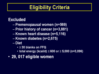 baseline, were -Premenopausal -Had a prior history of cancer other than skin cancer -Had a prior hx of HD -Had known diabetes -Had implausibly low or high total energy intake, or left blank a large number of questions on the FFQ This left approx. 29,000 eligible women at risk in this analysis. |