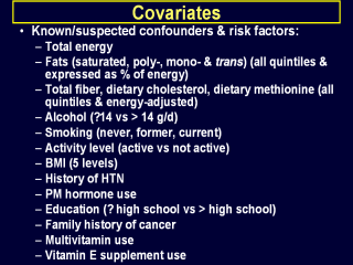 independent risk factors or potential confounders. As mentioned, total energy & dietary fats were forced to be constant in the models. A variable was retained in the final model, as all of these were, if it was statistically significant or, if it was not statistically significant and its removal from the model resulted in 10% or greater change in the effect estimates of protein, in which case it was considered a confounder and retained. - Although it may seem counter-intuitive to include components of dietary protein, such as dietary methionine, into the model with total protein, we did so with the attempt to isolate the effects of the protein component on outcome independent of known risk factors. For example, methionine has been reported to be the dietary precursor of homocysteine, a potential risk factor for CVD. |