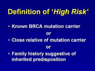 | For the purpose of this talk I’ve defined ‘high risk’ as increased risk based on a known or likely inherited predisposition, because this is the only population in which MRI screening has been specifically studied. Whether these findings can be extrapolated to other high risk groups is a subject I’ll come back to at the end. |