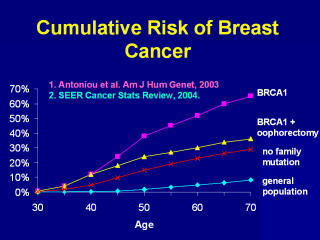 women. The first challenge is the very young age at which we have to start screening. A 30 year old BRCA1 mutation carrier has about the same annual risk of breast cancer as a 60 year old woman in the general population. The 2nd challenge is the very high sensitivity required of the screening regimen. Of 100 woman in the general population getting screening mammography with 80% sensitivity, only 2 will have a breast cancer missed by screening before they reach age 70. But 13 of 100 BRCA1 carriers will have a cancer missed by screening, even if screening mammography were equally sensitive for them, and it isn’t. |