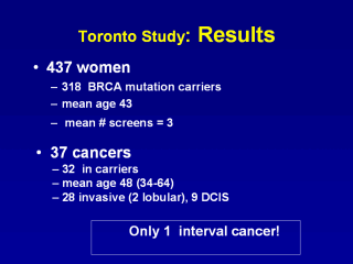 | 73 % were mutation carriers 37 cancers in 36 women 32 of the 37 cancer were mutation carriers, evenly split between BRCA1 abd 2 |