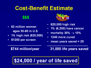 | Since up to $50,000 per year of life saved is generally considered to be an acceptable cost for a medical intervention, even if the actual survival benefit is only half of my estimate, the cost is still reasonable. |