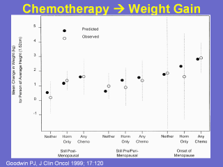 | You can see for each of these 3 groups separated by menopausal status, that chemotherapy in particular is associated with a weight gain of 2-3 kg. |