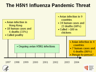 This slide shows the timeline from 1997 to 2004 of H5N1 among humans