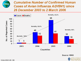 cases have increased. 30 cases have already been confirmed in the first two months of 2006. If this trend continues there will be much more cases in 2006 then previously seen. Case-specific mortality in confirmed cases have fluctuated, perhaps due to: -variation of medical support/assistance of availability and accessibility of the countries -experience dealing with this illness -decrease in virulence Vietnam had 100% (3/3) deaths in 2003 and 69% (20/29) deaths in 2004. In 2005 the largest number of confirmed cases (61) were identified in Vietnam with only 19 deaths (31%). |