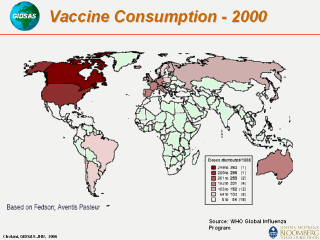 | The previous slide showed the limited capacity of the US to produce vaccine. This slide shows the vaccine consumption for the year 2000. US and Canada are the largest consumers of the vaccine. |